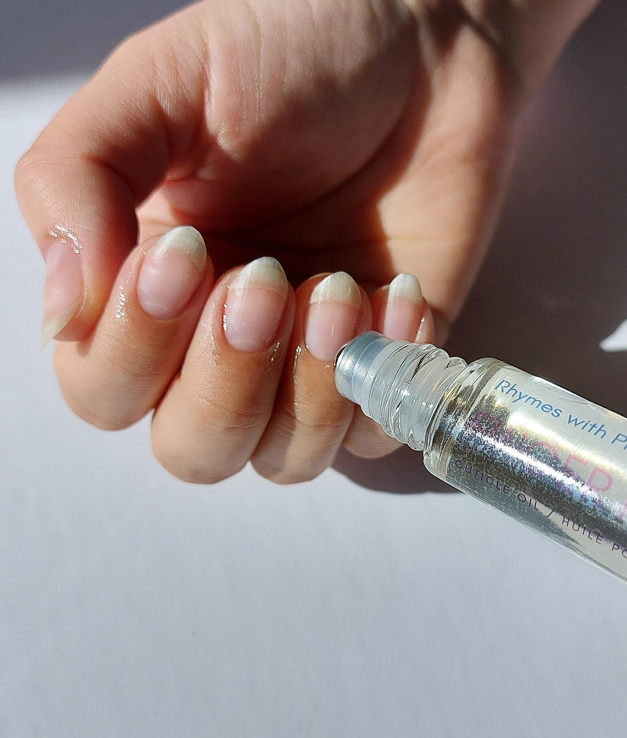 Moisturize! Aim for daily application. Lotion will do in a pinch, but cuticle oil perforates the nail plate better.